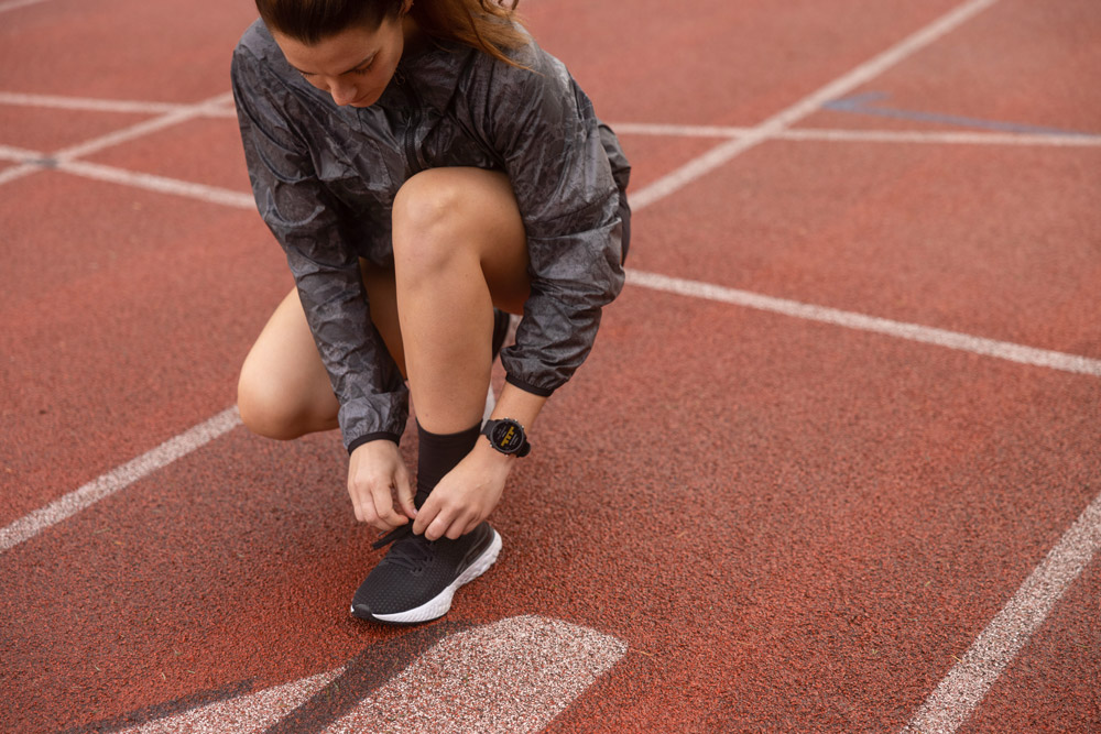 Ermittle dank vorinstalliertem Widget deine Laufleistung sowie weitere Laufeffizienzwerte direkt und in Echtzeit auf der Uhr (in Verbindung mit einem kompatiblen Brustgurt oder Running Dynamics Pod)
